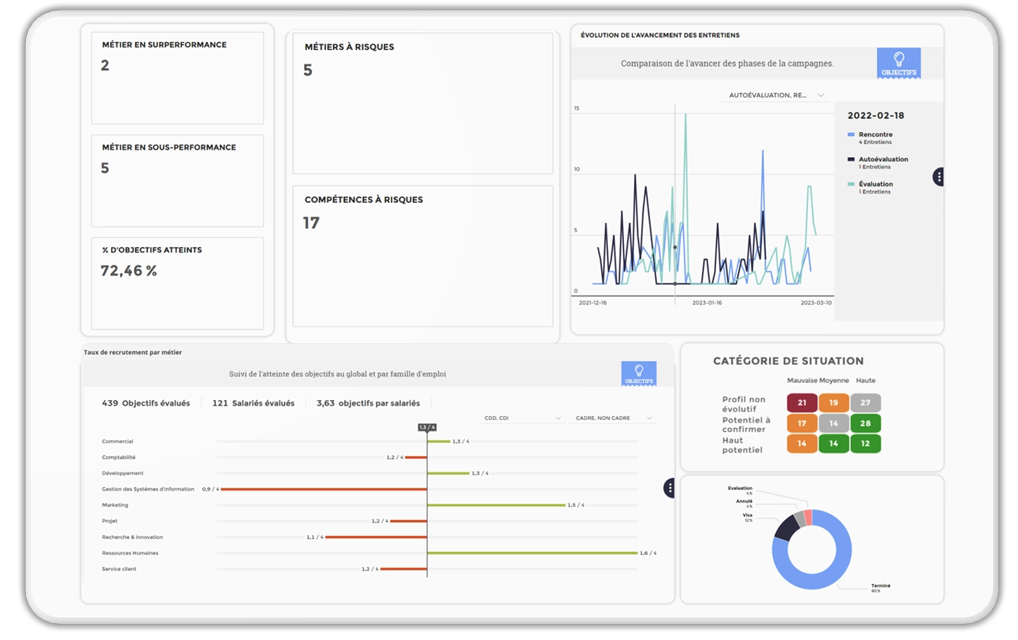 People Analytics vous permet de visualiser en temps réel vos indicateurs clés liés aux campagnes d’entretien.