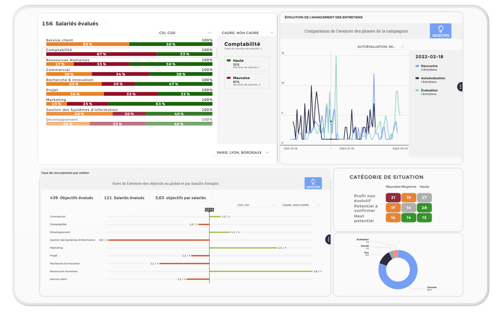 Oui. C’est même un de ses points forts : il est nativement interconnecté avec les briques Compétences, GEPP/GPEC, Plan de succession, etc. Vos décisions sont éclairées, vos parcours structurés.